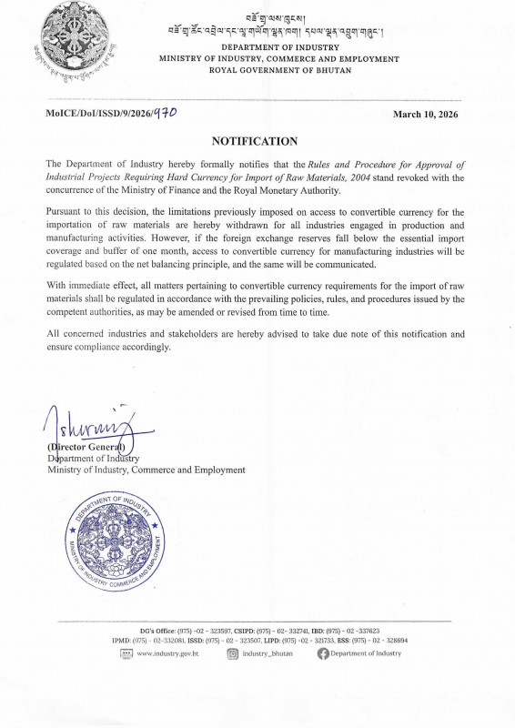 The Department of Industry hereby formally notifies that the Rules and Procedure for Approval of Industrial Projects Requiring Hard Currency for Import of Raw Materials, 2004 stand revoked with the concurrence of the Ministry of Finance and the Royal Monetary Authority.