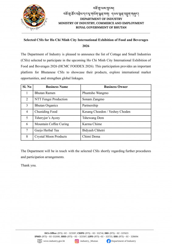 The Department of Industry is pleased to announce the list of Cottage and Small Industries (CSIs) selected to participate in the upcoming Ho Chi Minh City International Exhibition of Food and Beverages 2026 (HCMC FOODEX 2026). This participation provides an important platform for Bhutanese CSIs to showcase their products, explore international market opportunities, and strengthen global linkages.