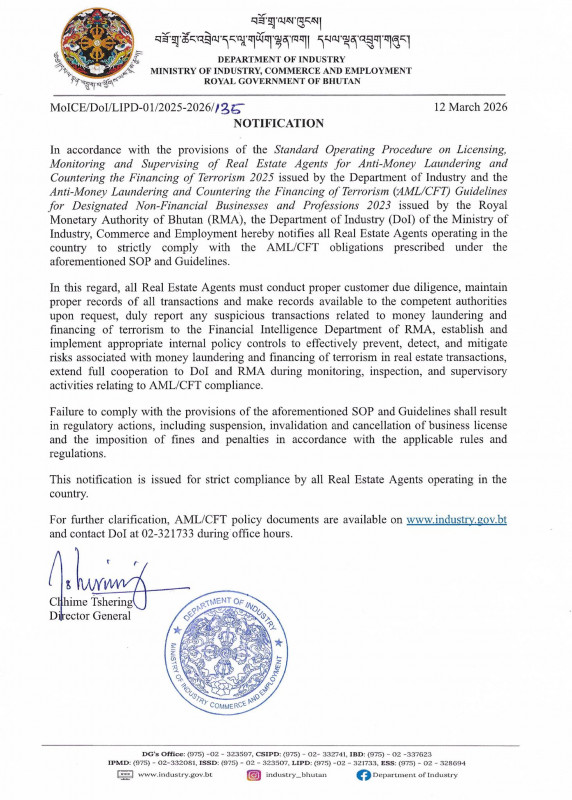 In accordance with the provisions of the Standard Operating Procedure on Licensing, Monitoring and Supervising of Real Estate Agents for Anti-Money Laundering and Countering the Financing of Terrorism 2025 issued by the Department of Industry and the Anti-Money Laundering and Countering the Financing of Terrorism (AML/CFT) Guidelines for Designated Non-Financial Businesses and Professions 2023 issued by the Royal Monetary Authority of Bhutan (RMA), the Department of Industry (DoI) of the Ministry of Industry, Commerce and Employment hereby notifies all Real Estate Agents operating in the country to strictly comply with the AML/CFT obligations prescribed under the aforementioned SOP and Guidelines.